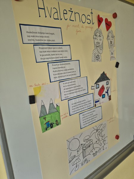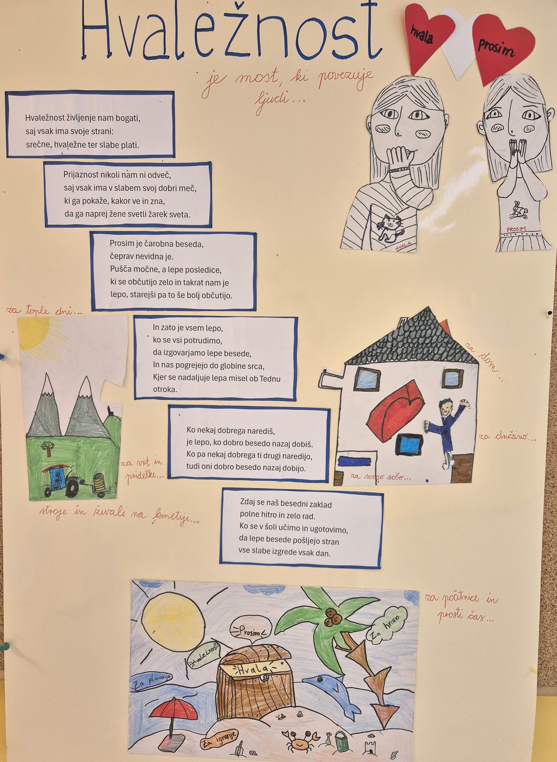 Otroci so delili svoje izkušnje prijaznosti v šoli, doma in v vsakdanjih situacijah. Nato smo ustvarjali različne izdelke – risbe, plakate in pesmi – ki odražajo pomen besed “prosim” in “hvala” ter “hvaležnost”.