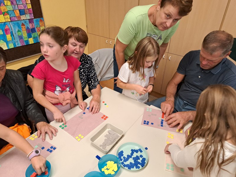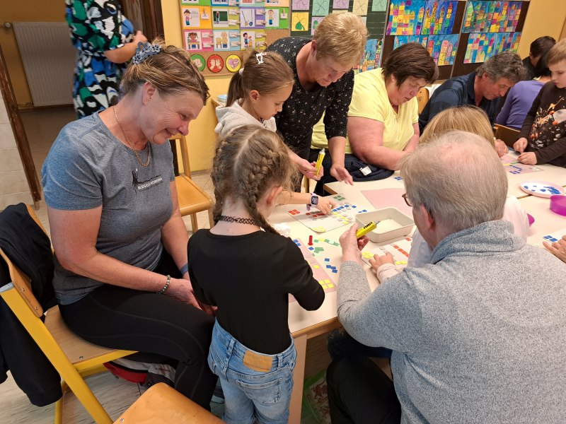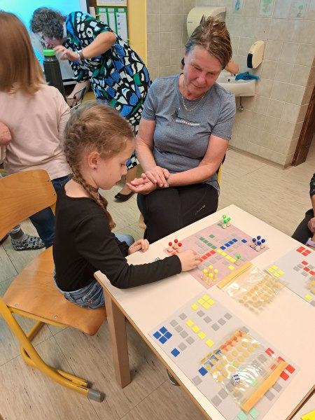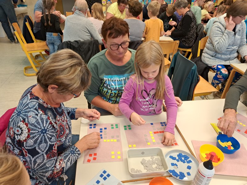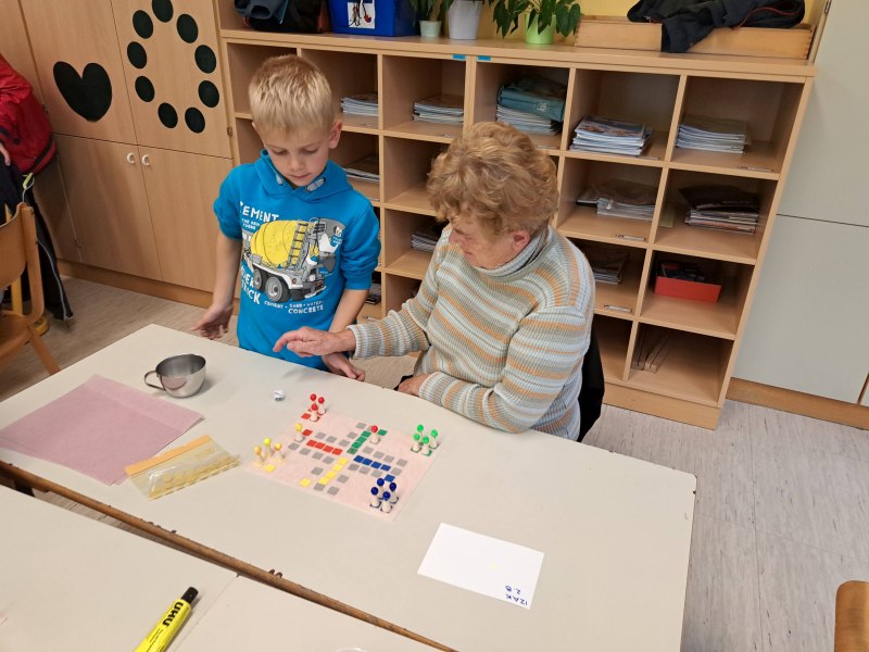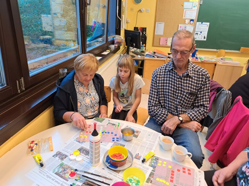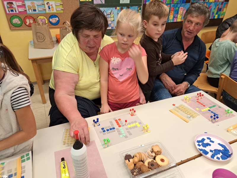 Učenci in dedki ter babice so se ob skupnem ustvarjanju družabne igre »človek, ne jezi se« odlično povezali.