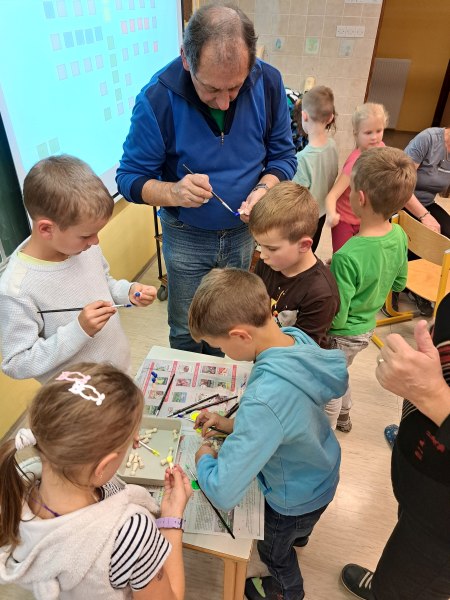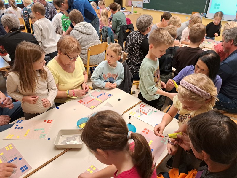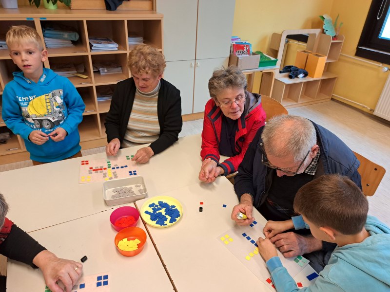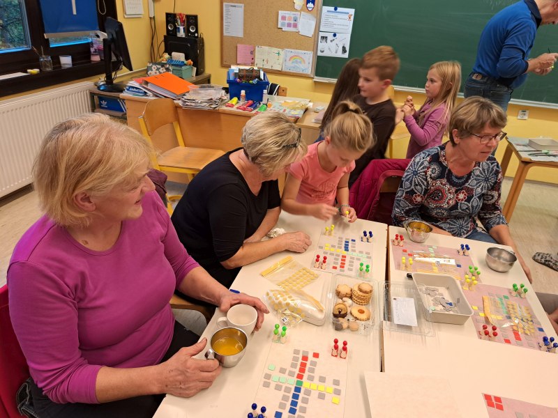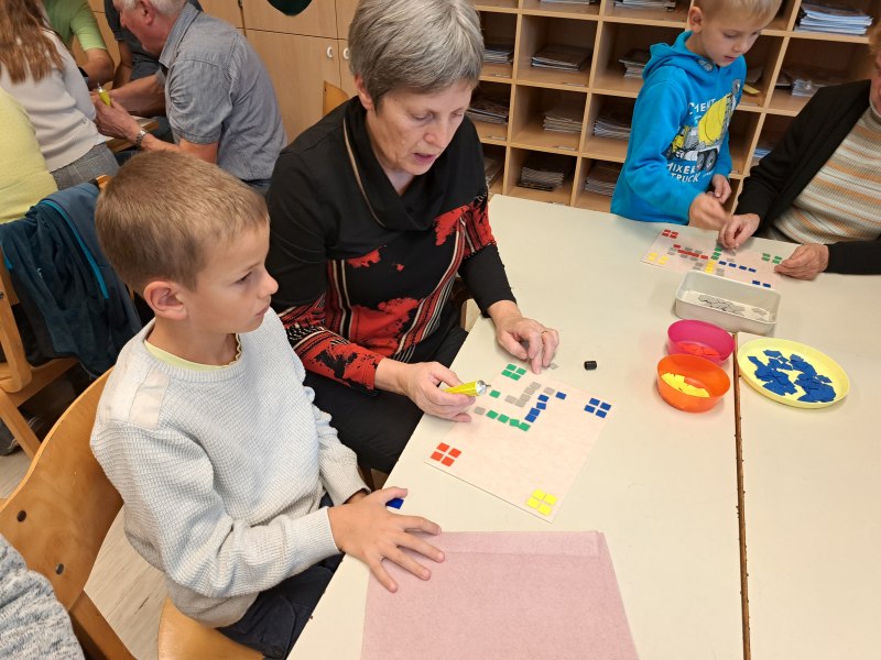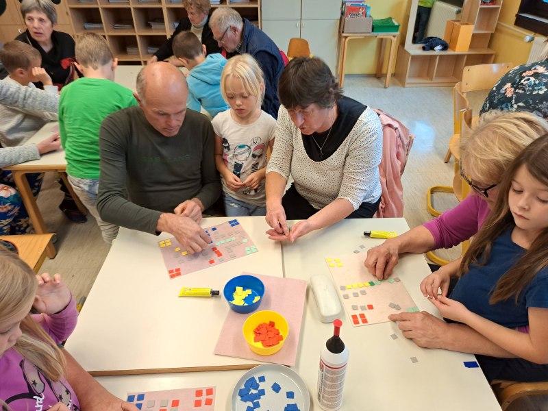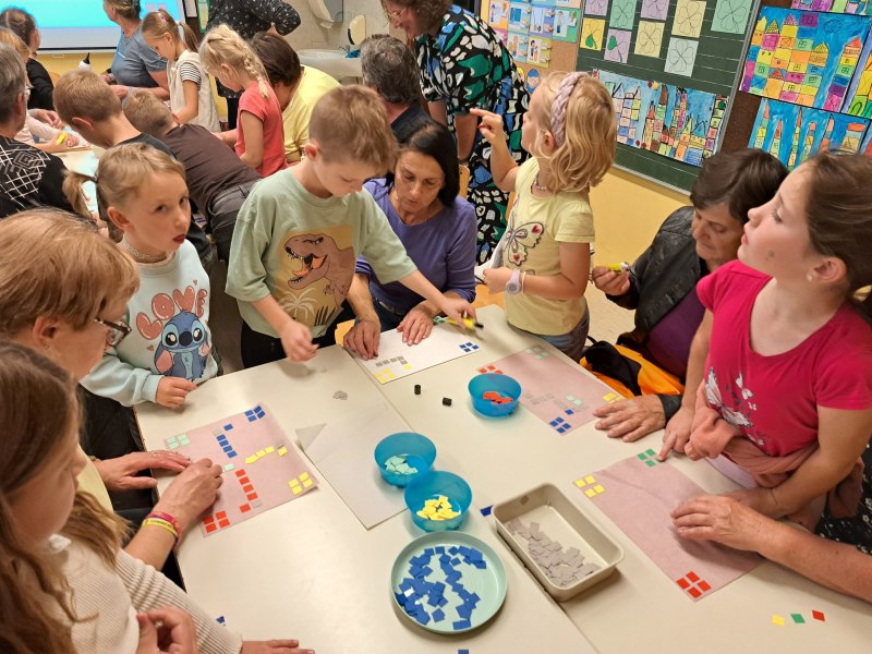 Učenci in dedki ter babice so se ob skupnem ustvarjanju družabne igre »človek, ne jezi se« odlično povezali.
