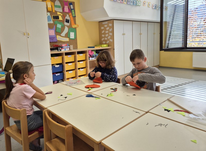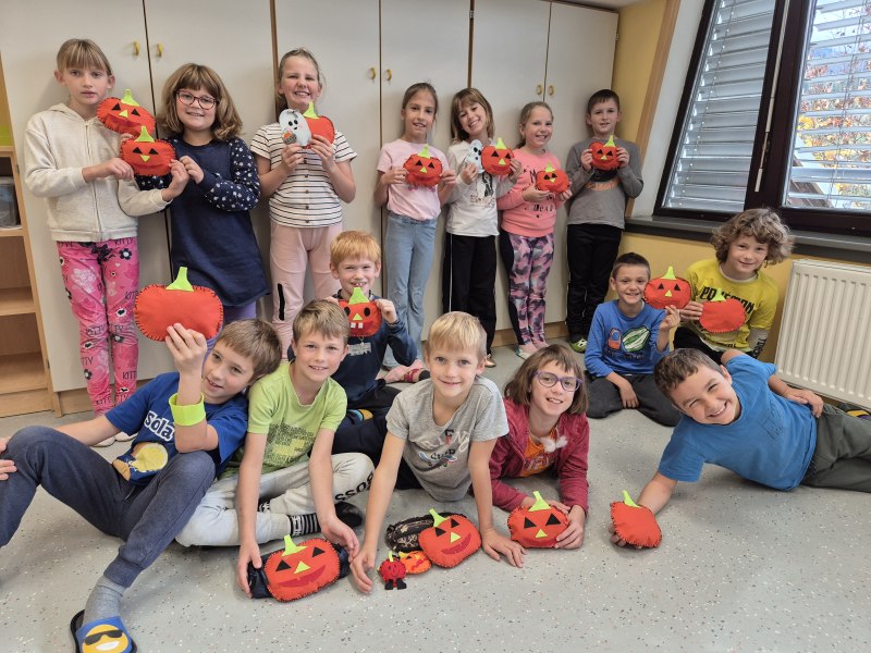Danes mi je bilo všeč, da smo lahko sedeli skupaj s sošolci in si pomagali. Pa vatka mi je bila všeč, da smo z njo napolnili bučo. (Tadej, 3. b)