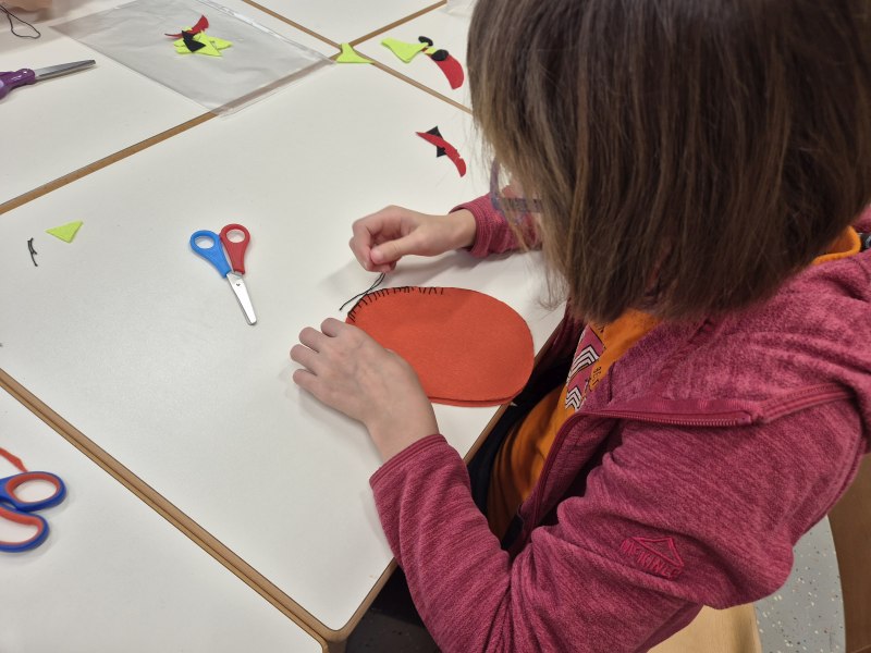 Tretješolci smo najprej svoje šivanke ob papirnati vadnici naučili zančnega vboda, nato pa jih poslali na druženje s filcem. Urili smo vztrajnost in potrpežljivost. Premagali smo vozle, prekratke niti, obupanost po prvi obšiti strani in se na koncu šivalnega dne veselili svojih izdelkov.