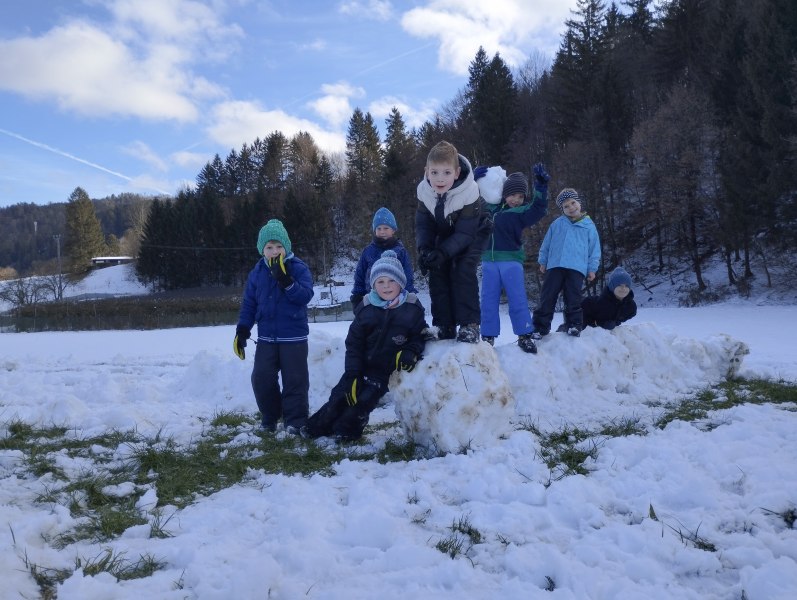 V sredo, 14. januarja, se je 35 nasmejanih prvošolcev odpravilo na krajši zimski pohod do Svetega Križa. Svež zrak in hoja v hrib sta nam hitro ogrela lica. Po zasluženi malici pa se je prava zabava šele začela. Snežna odeja na našem bregu je počasi kopnela, mi pa smo se drčali. Z lopatkami smo izkoriščali še zadnje zaplate snega in tekmovali v najdaljših spustih. Nekateri pa so svojo ustvarjalnost pokazali pri gradnji mogočnih utrdb in snežakov.