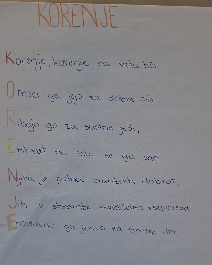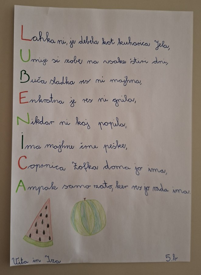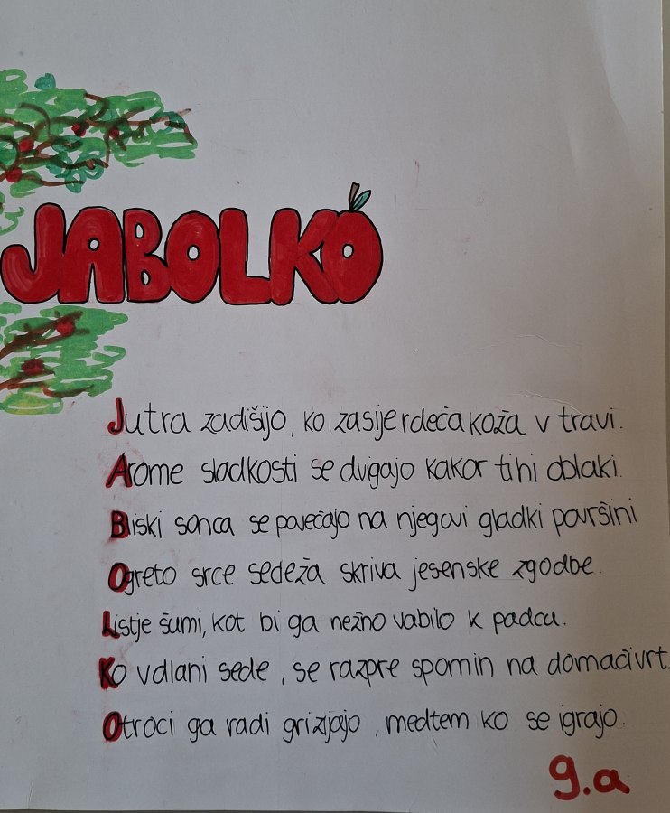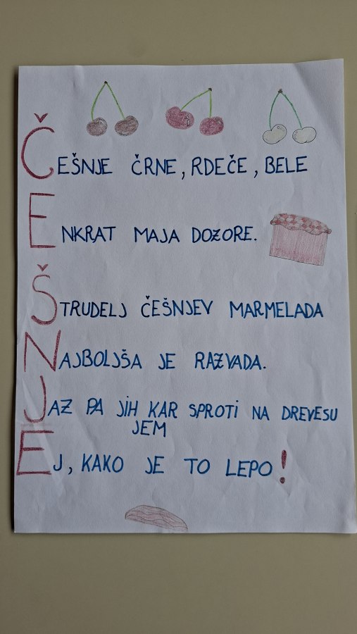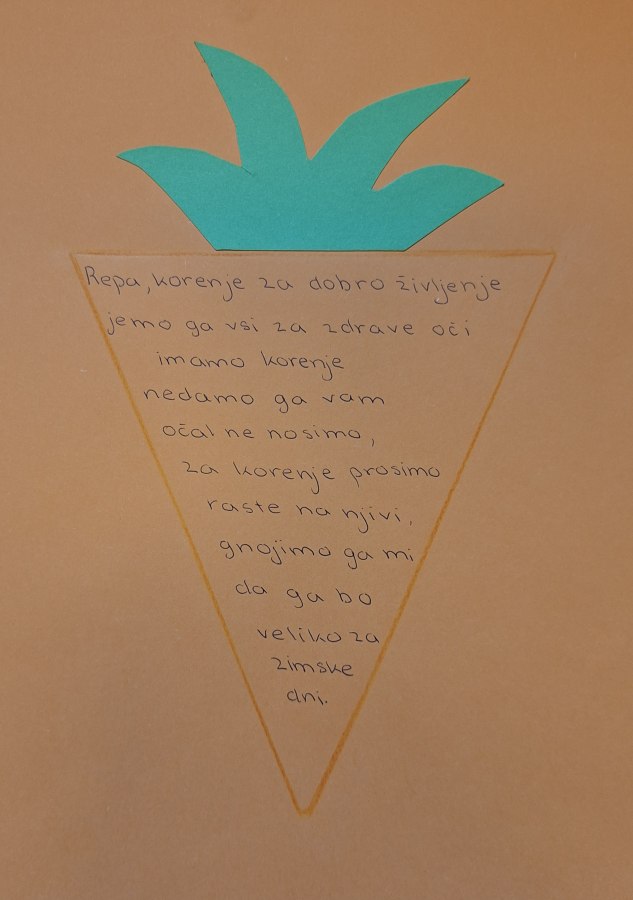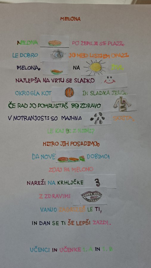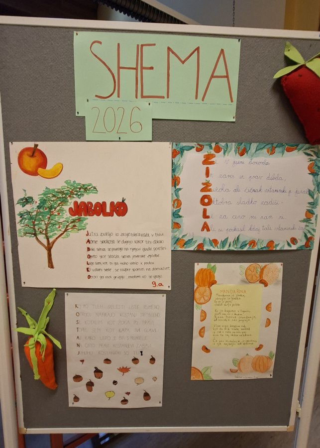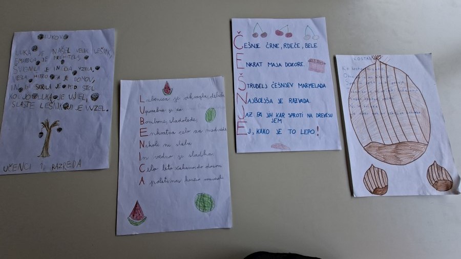 Učenci in učenke od 1. do 9. razreda so skupaj z razredniki na centralni in podružnični šoli pisali pesmice o različnih vrstah sadja in zelenjave. Nastala je zelo zanimiva in izvirna zbirka pesmic, nekateri učenci pa so izdelali še plakate.