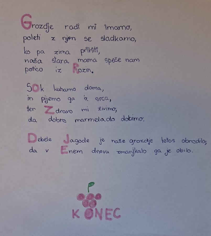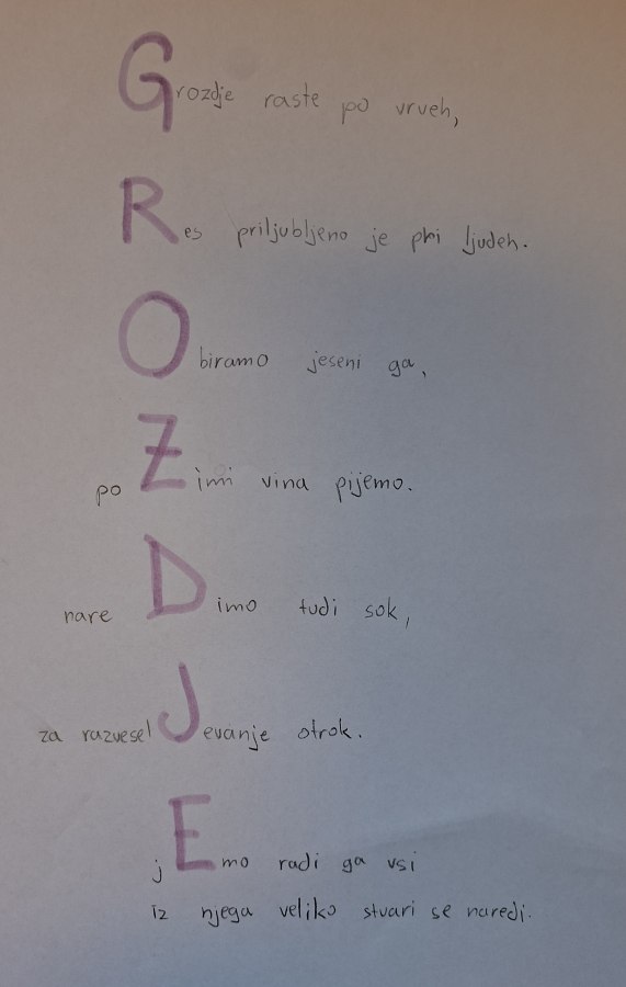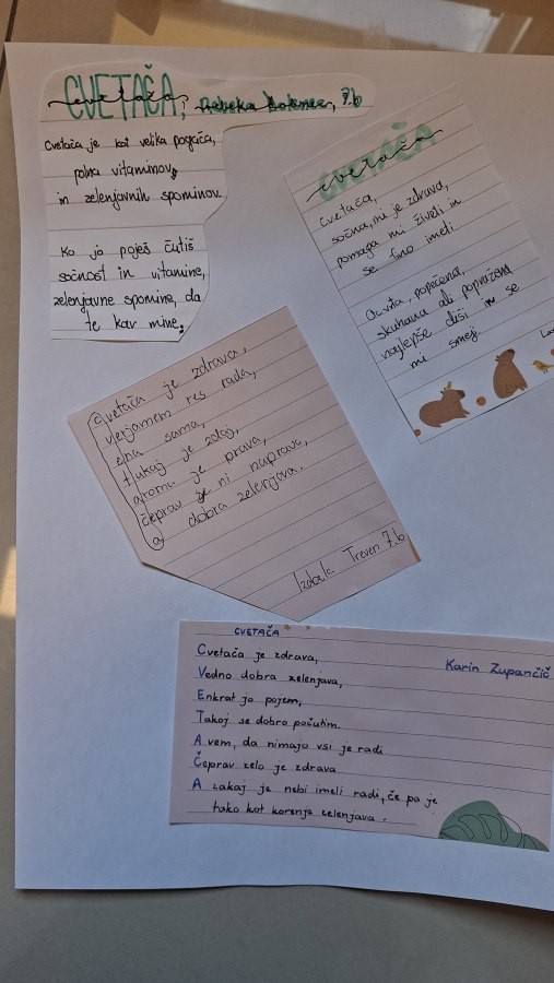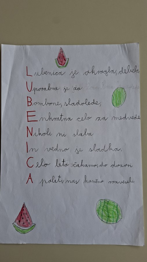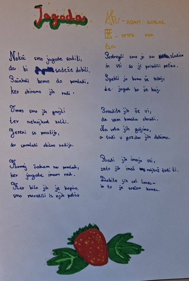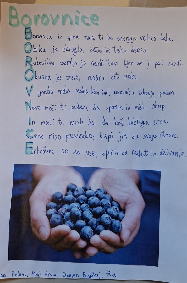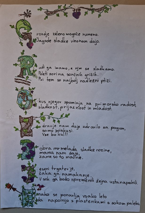 Učenci in učenke od 1. do 9. razreda so skupaj z razredniki na centralni in podružnični šoli pisali pesmice o različnih vrstah sadja in zelenjave. Nastala je zelo zanimiva in izvirna zbirka pesmic, nekateri učenci pa so izdelali še plakate.