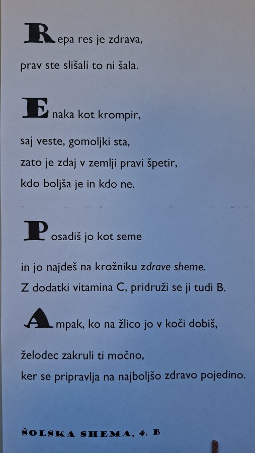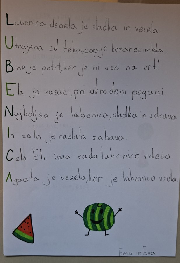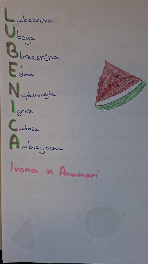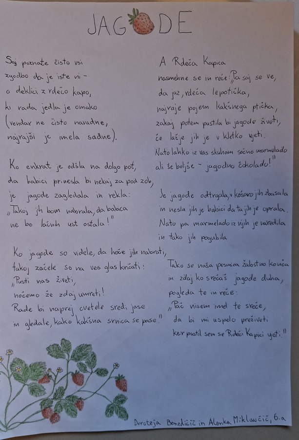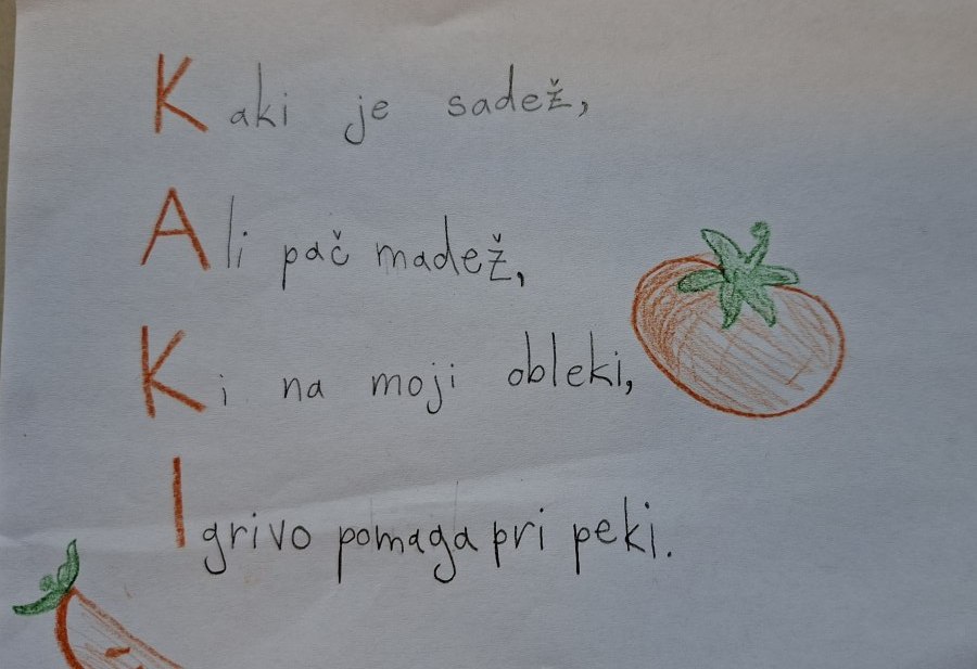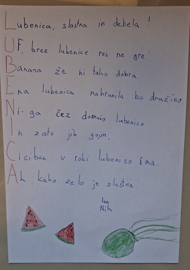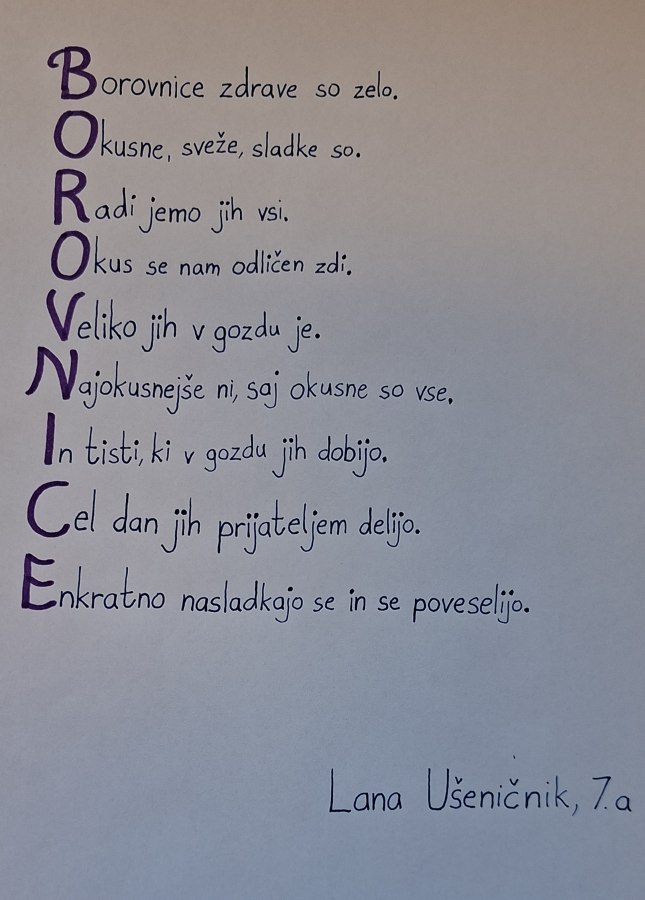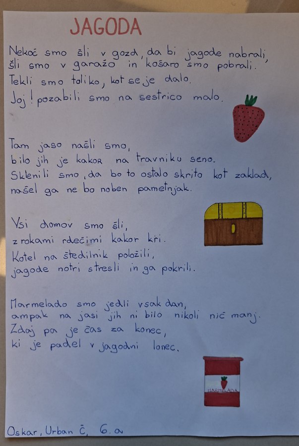 Učenci in učenke od 1. do 9. razreda so skupaj z razredniki na centralni in podružnični šoli pisali pesmice o različnih vrstah sadja in zelenjave. Nastala je zelo zanimiva in izvirna zbirka pesmic, nekateri učenci pa so izdelali še plakate.
