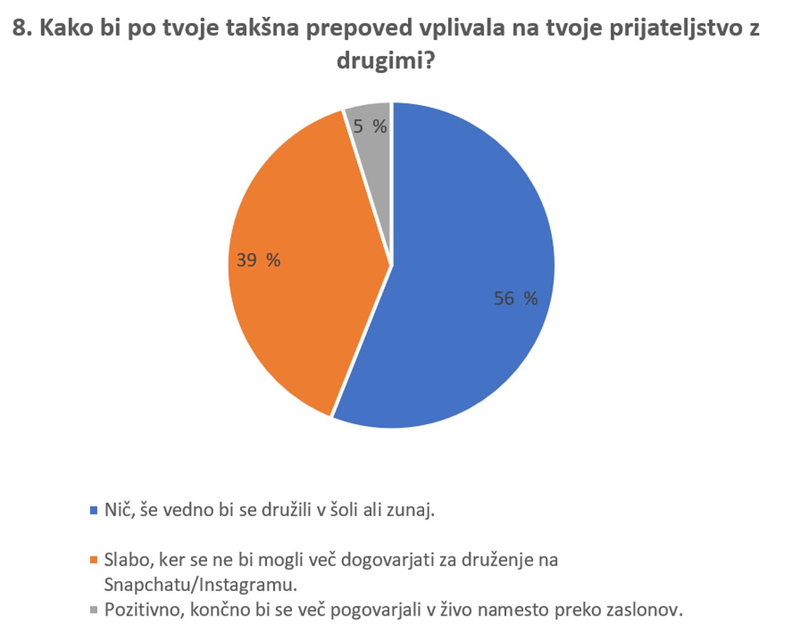 Rezultate ankete smo skupaj analizirale in pokomentirale. Odgovori na anketna vprašanja nas niso preveč presenetili, smo pa ugotovile, da se pri nekaterih kaže precejšnja razlika med dekleti in fanti. Veseli nas predvsem dejstvo, da takšen ukrep ne bi vplival na prijateljstvo ter druženje s prijatelji in znanci.