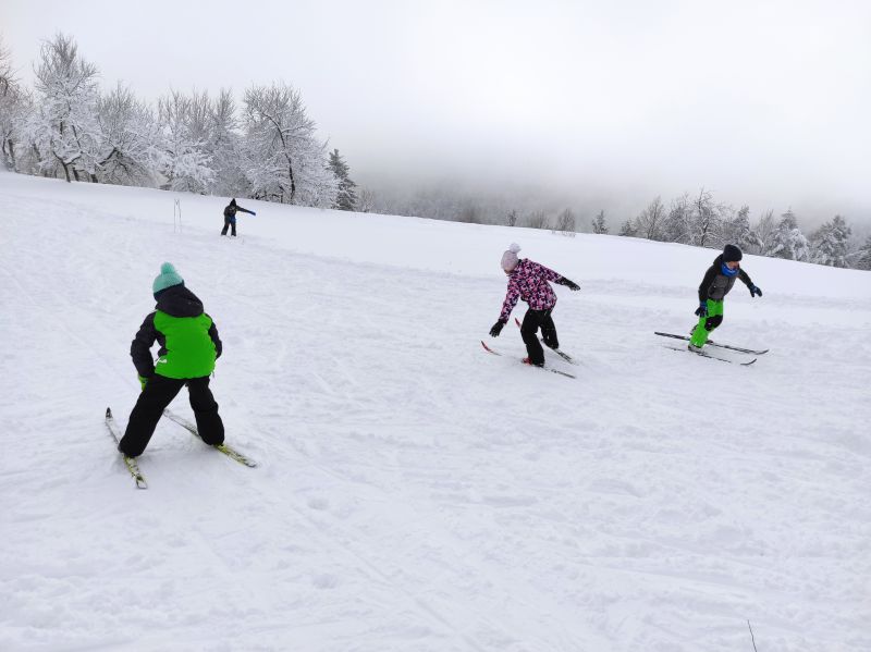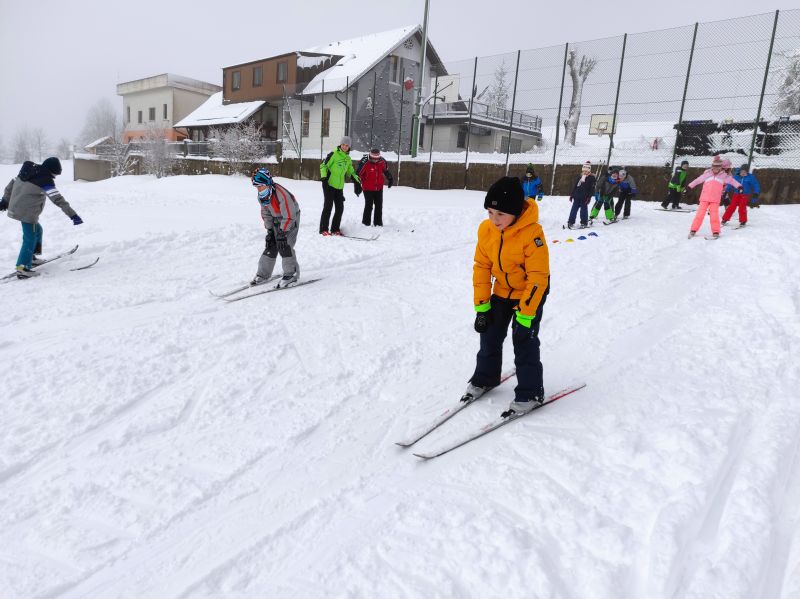 Zbudili smo se v zasneženo jutro. Zajtrk je bil zelo dober. Dopoldan smo se učili streljati z lokom. Lok je bil zelo velik. Najprej nam je učitelj povedal in pokazal, kako se ga uporablja. Po štirje v skupini smo streljali z lokom. Vsak je lahko ustrelil šestkrat. Ostali, ki so čakali, so se igrali z blazinami in obroči v igralnici. Ko smo končali, smo šli na malico. Po malici smo se oblekli v kombinezone in dobili tekaško opremo. Na snegu smo se najprej ogreli s pesmico Si že videl kdaj pingvina piti čaj. Naučili smo se pobirati in narediti pico, da smo se ustavili. Na progi smo se spuščali, velikokrat smo padli. Ampak vseeno je bilo zelo dobro. Za kosilo smo jedli juho, kuskus, piške in bučke v omaki. Po kosilu smo imeli počitek. V sobi smo se igrali družabne igre in pospravljali. Delali smo tudi zapestnice. Po koncu počitka smo spet šli ven na sneg. Vozili smo se z bobi. Delali smo proge in skakalnice. Bilo nam je zelo všeč. Nekateri smo začeli delat iglu. Nabralo se nas je že veliko in iglu je bil hitro velik. Za malico smo imeli sadje in makovo pecivo, ki je ostalo od kosila. Bilo je zelo okusno, kuharici bi rekli za recept. Po malici smo spoznavali vremenske pripomočke. S palico za merjenje višine snega smo izmerili višino snega. Zapadlo ga je približno 22 centimetrov. Na koncu smo izdelali vetrnice iz papirja in palčk. Za večerjo je bila pica. Nismo je smeli jesti z rokami, ampak smo morali jesti s priborom. Po večerji smo domov napisali razglednice. In temu je sledila najboljša zabava v šoli v naravi. Učiteljica je pripravila zvočnik, disko kroglo in projektor s pesmimi. Vsi smo se zabavali in plesali po svoje. Čisto prepoteni smo šli v sobe pod tuš. Danes nam bo učiteljica prebrala pravljice o pošasti Mici. Nato pa hop v posteljo.
